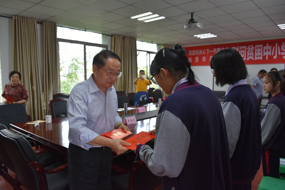 市关工委执行主任、市关心下一代基金会顾问邱德峰为18名蜀光学子送去慰问金和美好的祝福