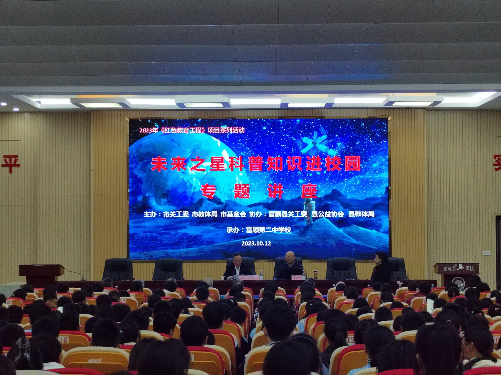 10月12日,由市关工委、市教育和体育局、市关心下一代基金会联合主办的“未来之星”科普知识进校园活动,同步走进富顺县第二中学校和富顺县第三中学校。活动邀请中国核工业集团公司高级工程师王文华作关于中国航天科技成就的专题讲座,引导大家了解国防科技成就,感悟空天报国精神,激发探索科学热情。